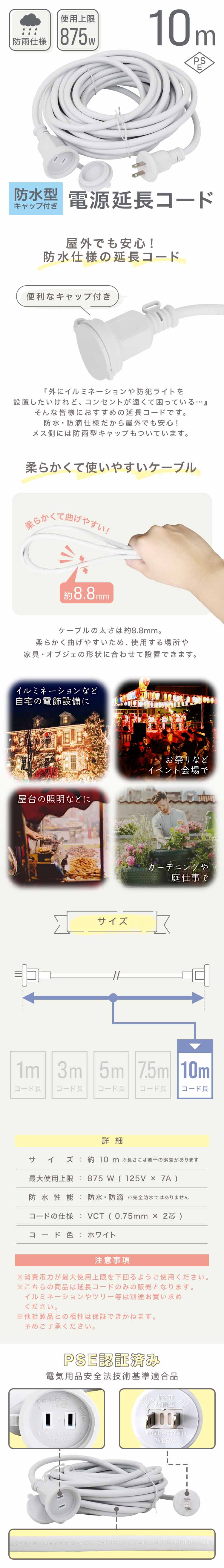 - 電源延長コード 延長ケーブル 延長コード 屋外 10m 電源 コード 屋内 屋外 電源コード アウトドア イルミネーション PSE認証 新品 未使用