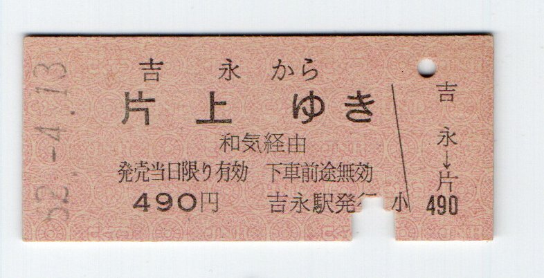 - T 国鉄 山陽本線 吉永から 和気経由 片上ゆき 連絡乗車券 S52年 T