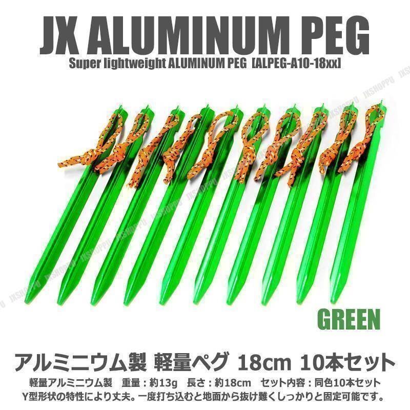 - 送料0円 Y型 テント ペグ 18cm [グリーン] 10本セット 軽量 ジュラルミン製 アルミニウム アルマイト 紐付属 アウトドア キャンプ用品