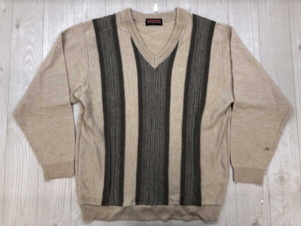 - SEPLASKA レトロ トラッド ストライプ 3D 立体模様編み リブ切替 Vネック ニット セーター プルオーバー メンズ ウール混合 L ベージュ