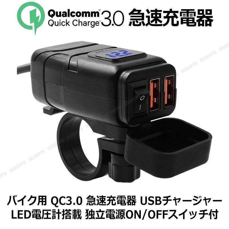 - 送料0円 バイク用 QC3.0 急速充電器 [ブルー] USBチャージャー LED電圧計搭載 電源ON/OFFスイッチ付 スマホやタブレットの充電に 汎用