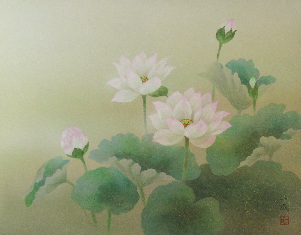 > ◆◇掛軸 遠田一成 蓮 尺八横 現代作家新作掛軸 hanging scroll◇◆夏 年中掛け 普段掛け 日本画 JY1916