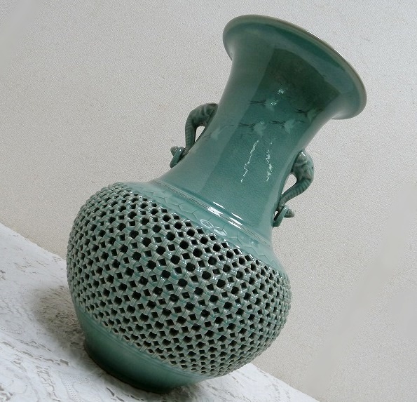 > (☆BM)陶器製 東山 作 鶴紋 花器 共耳付き 高さ44.5㎝ 青磁 花瓶 透かし細工 象 双耳 網目 貫入り 高麗