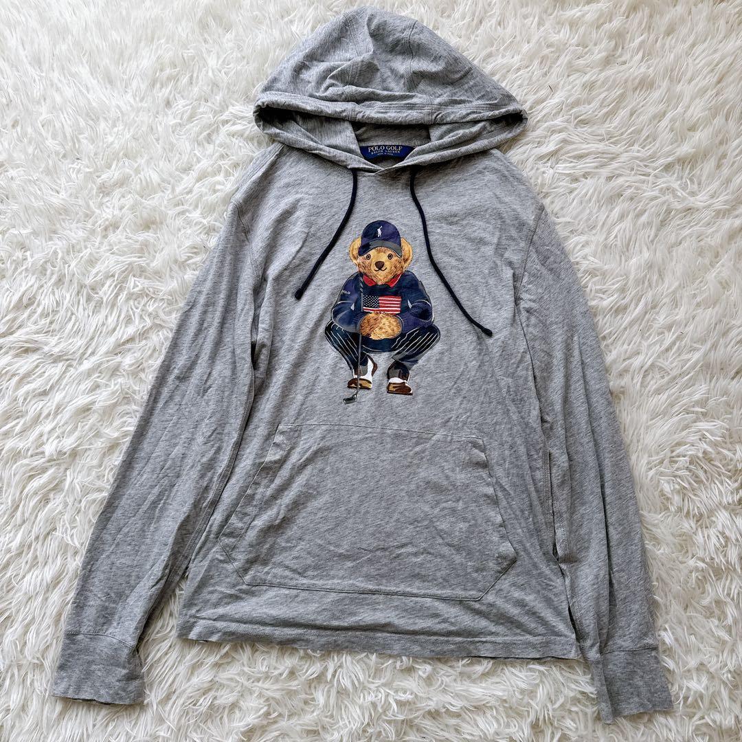- POLO GOLF RALPH LAUREN ポロゴルフ ラルフローレン 星条旗ポロベア プリントフーディ 薄手パーカー グレー スウェット トレーナー
