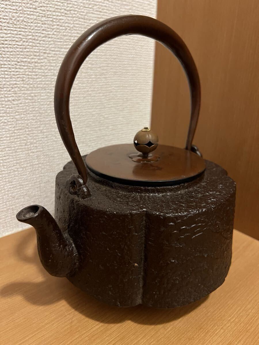 - 鉄瓶 ⑤ 共箱付 南部鉄器 茶道具 アンティーク 茶器 金属工芸 工芸品 骨董品 古美術 銅製蓋 山水木瓜 湯沸かし ツマミ コレクション