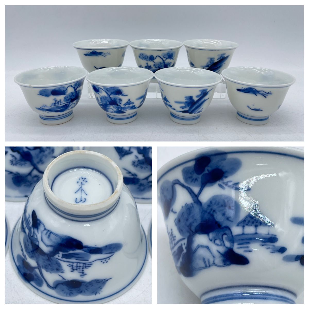 - 京焼 栄山造 お猪口 ぐい呑み 湯呑 染付 山水画 7客まとめ 径5.7cm 伝統工芸 古美術 古玩 時代物 酒器 陶器 焼物 茶道具 陶芸茶碗 (11897)