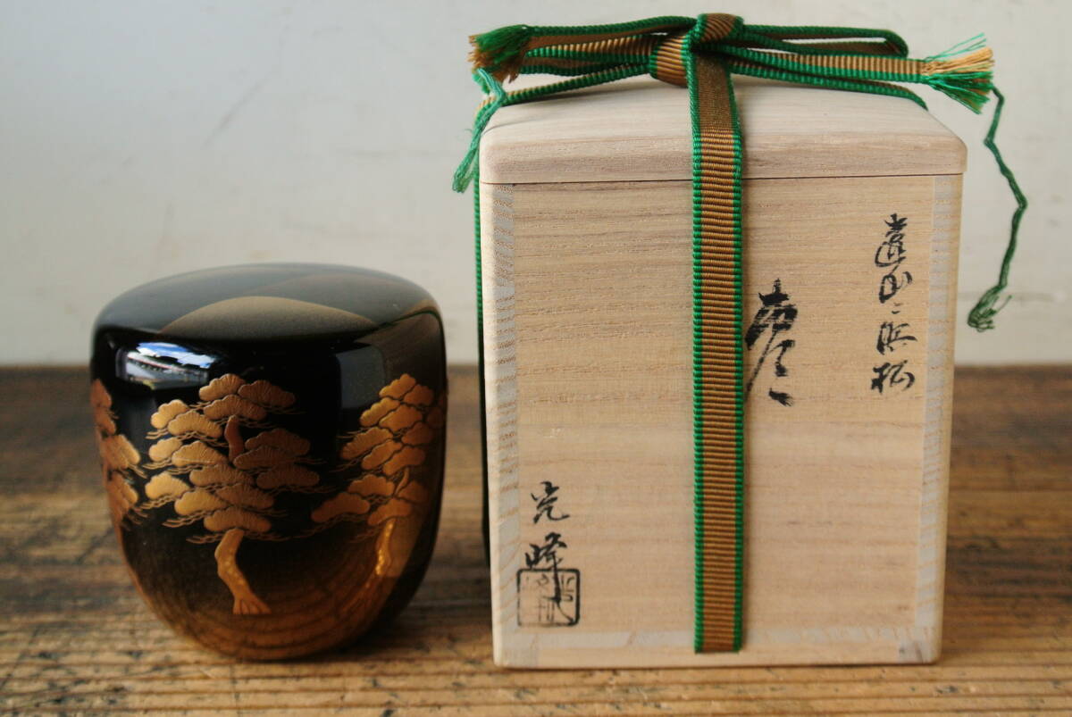 光峰作 遠山に老松 棗 内銀溜 金蒔絵 金梨子地 共箱です。