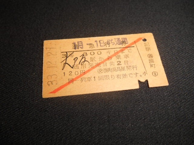 - 国鉄 A型硬券 準急行券 300キロまで 120円 斜め1本 3等 大阪駅から乗車 昭和33年 送料85円