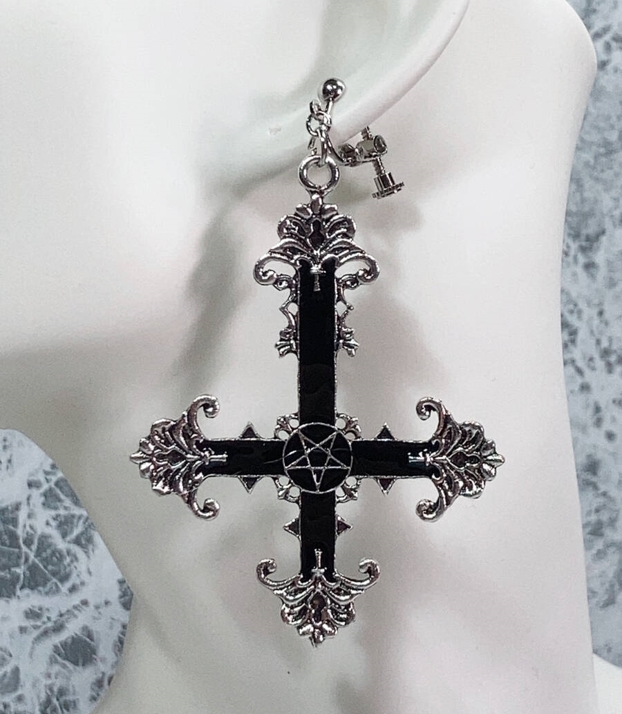 - ◆同梱発送可◆「黒い逆さ十字/六芒星 イヤリング 左右セット 女性用/レディース ゴスロリ」fire_sale 【タグ:アクセサリー】