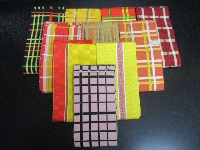 - 中古 半幅帯 リメイク 絹 化繊 民芸 アンティーク 可愛い 和柄 縞 幾何学 まとめて10本 和装小物 着物【夢職】☆