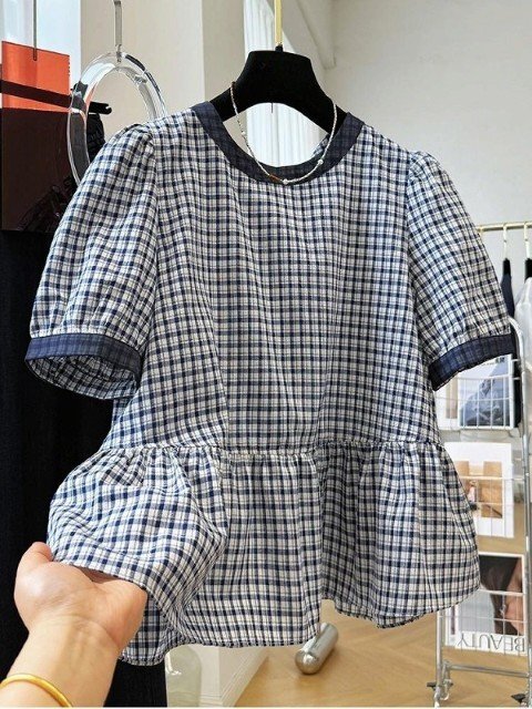 - トップス シャツ ブラウス 半袖 チェック柄 裾フリル シンプル カジュアル かわいい レディース L ダークブルー