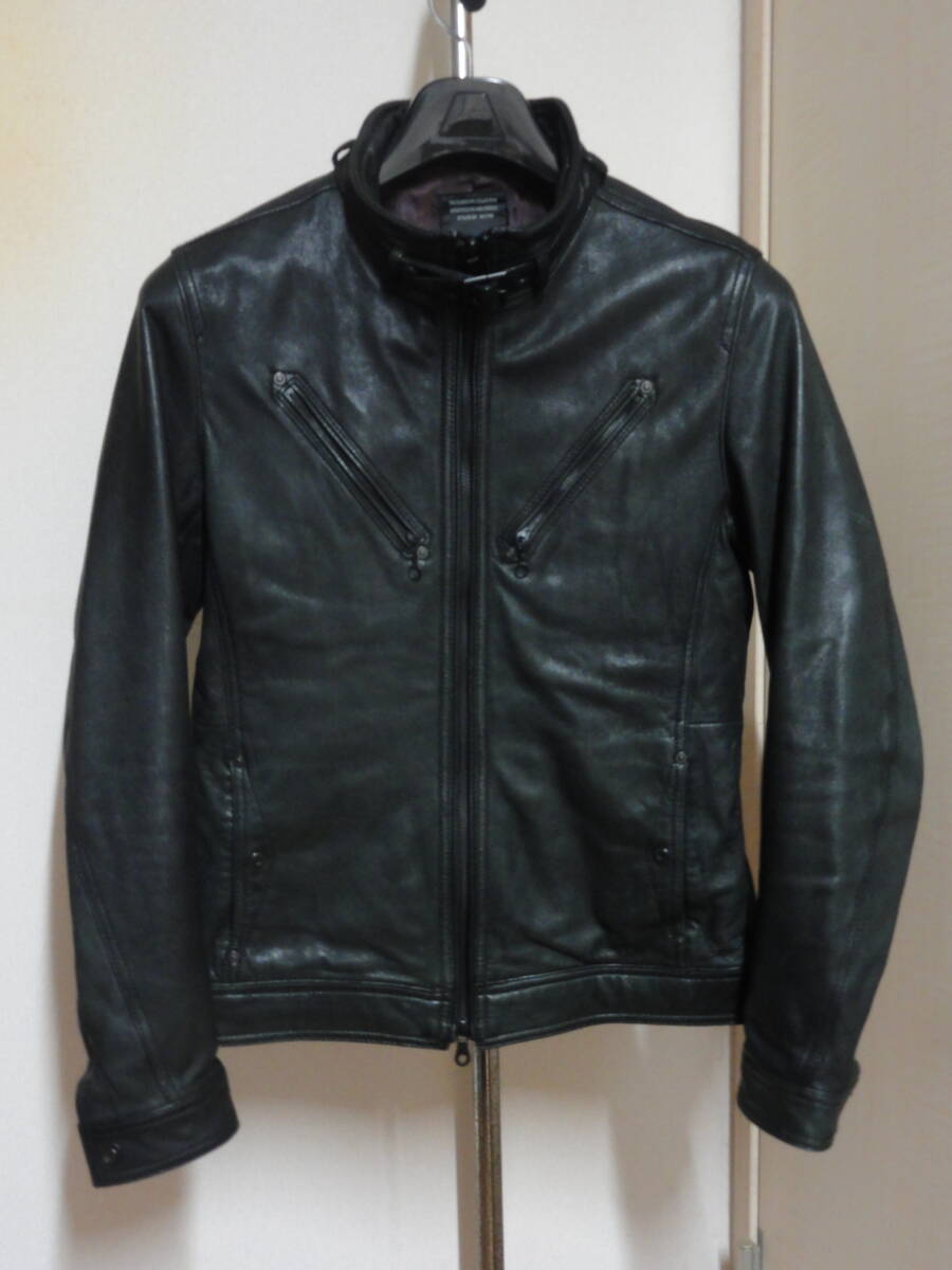 - 格安高級やぎ革使用レア・NICOLE CLUB FOR MEN(二コル)・黒系地・襟ベルト&斜め配置の胸ジップポケット付き・高級ライダース系ブルゾン 46