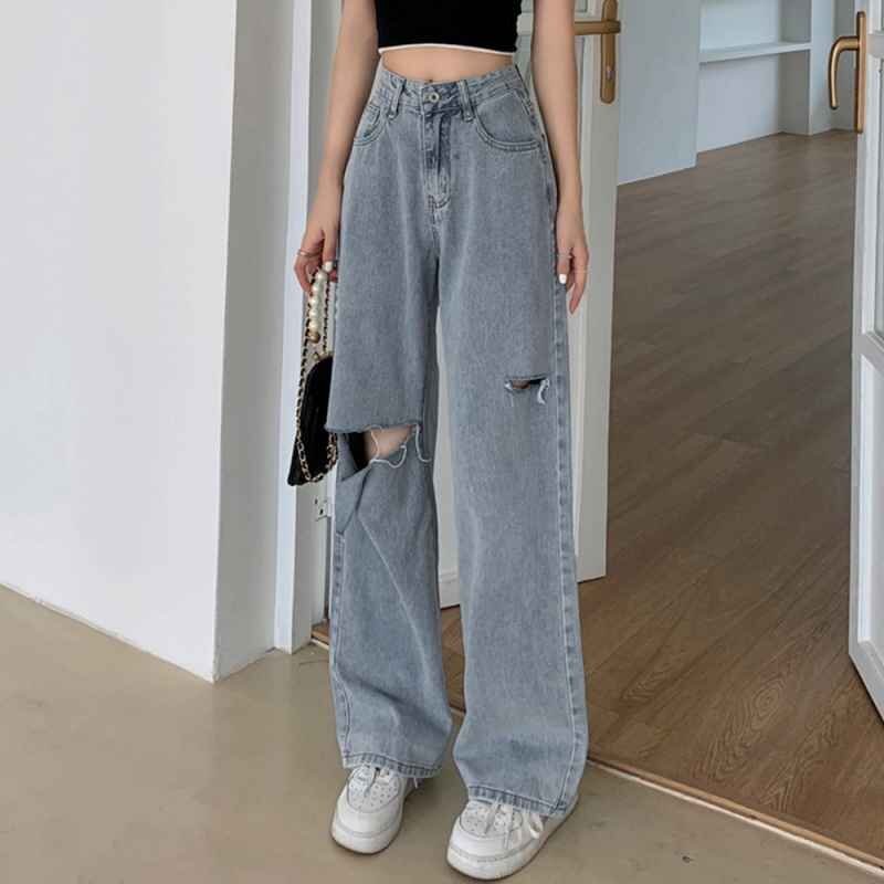 - ダメージパンツ 穴あきジーンズ クラッシュ カジュアル ジーパン S サックス