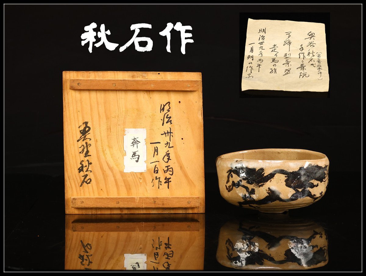 > 【吉】CN763 京焼 【秋石作】 奔馬 茶碗/箱付 時代のフルカンニュウあり!