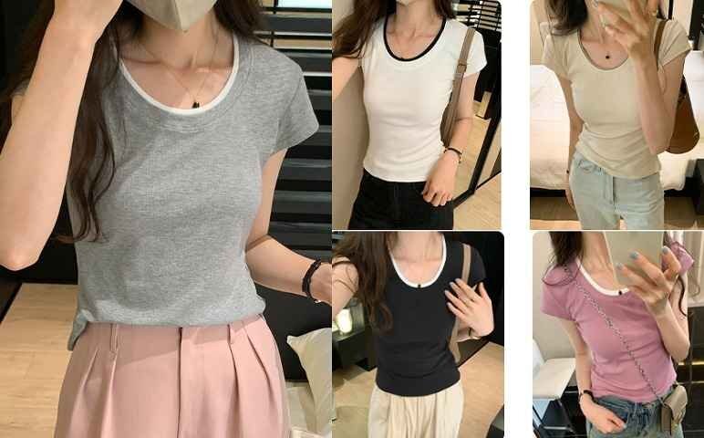 - 全5色 半袖Tシャツ ショート丈 切り替え スリム 着痩せ シンプル M グレー