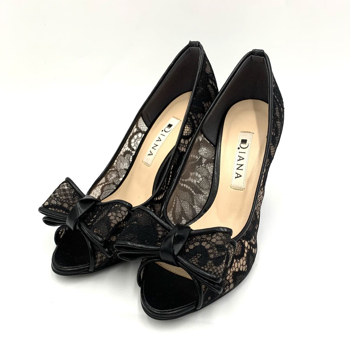 - K ▼ 洗練されたデザイン '日本製' DIANA ダイアナ 本革 レース リボン オープントゥ ヒール パンプス 21.5 G レディース 婦人靴 シューズ