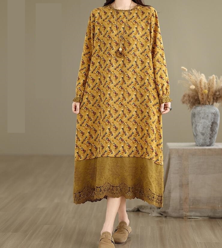 - 上質 ワンピース 綿混 洋服ミックス アンティーク風 ロマンファッション ゆったり フリーサイズ 長袖 花柄