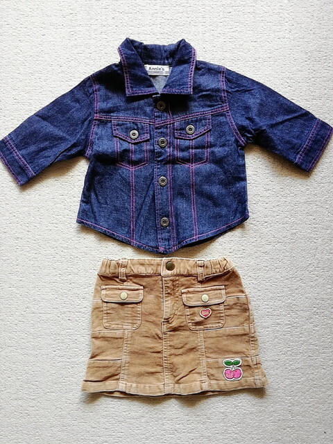 - 95 100 美品 七分袖 デニムシャツ 茶色系 スカート ワッペン 女の子 女児