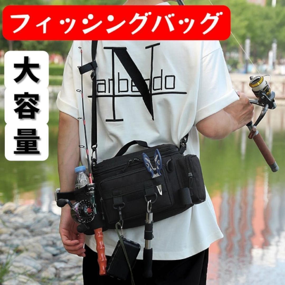 - 釣りバッグ フィッシングバッグ ショルダー 大容量 アウトドア 多機能 釣竿 黒