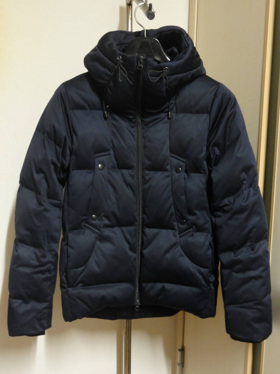 > 格安ダウン78%フェザー22%防寒モデル・NANO BASE(ナノユニバース)・濃紺系地・防寒重厚立襟カバーフード付き・高級ライダース系ブルゾン M