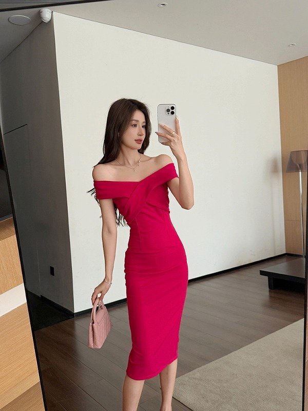 - ワンピース フリル 切り替え スリム 着痩せ シンプル XL ローズ