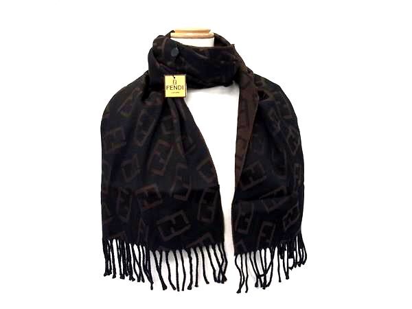 > 1円 ■新品同様■ FENDI フェンディ ズッカ柄 ウール100% マフラー ストール ショール 防寒具 レディース メンズ ブラウン系 BP5158