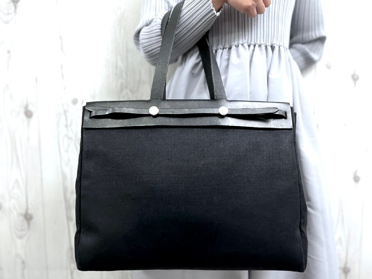 > 美品 HERMES エルメス エールバッグ カバスGM トートバッグ ハンドバッグ バッグ トワルオフィシエ×レザー 黒 A4収納可 91695