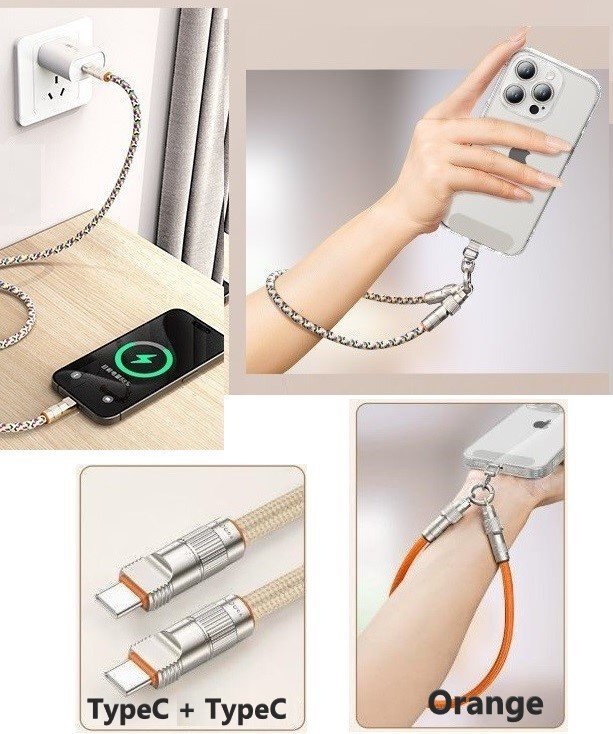 - スマホハンドストラップ オレンジ 30cm 充電ケーブル 2in1 TypeC+TypeC 充電コード