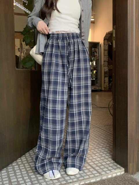 - ロングパンツ ストレートパンツ ボトムス チェック柄 シンプル カジュアル M ブルー