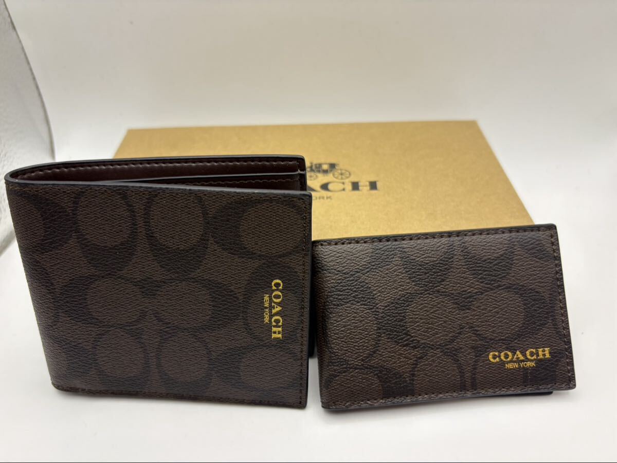 > 《新品》《未使用》 COACH 二つ折り財布 ブラック 小銭入れ 札入れ ウォレット 財布 コーチ!パスケース付き ダークブラウン コーチ