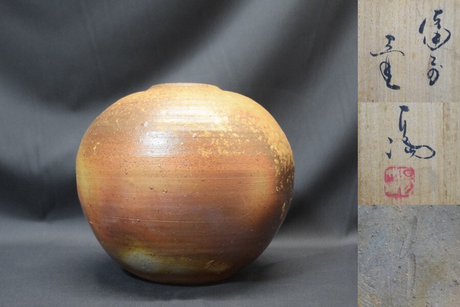 - 伊勢崎満 備前焼 花器 備前 壺 共箱 共布