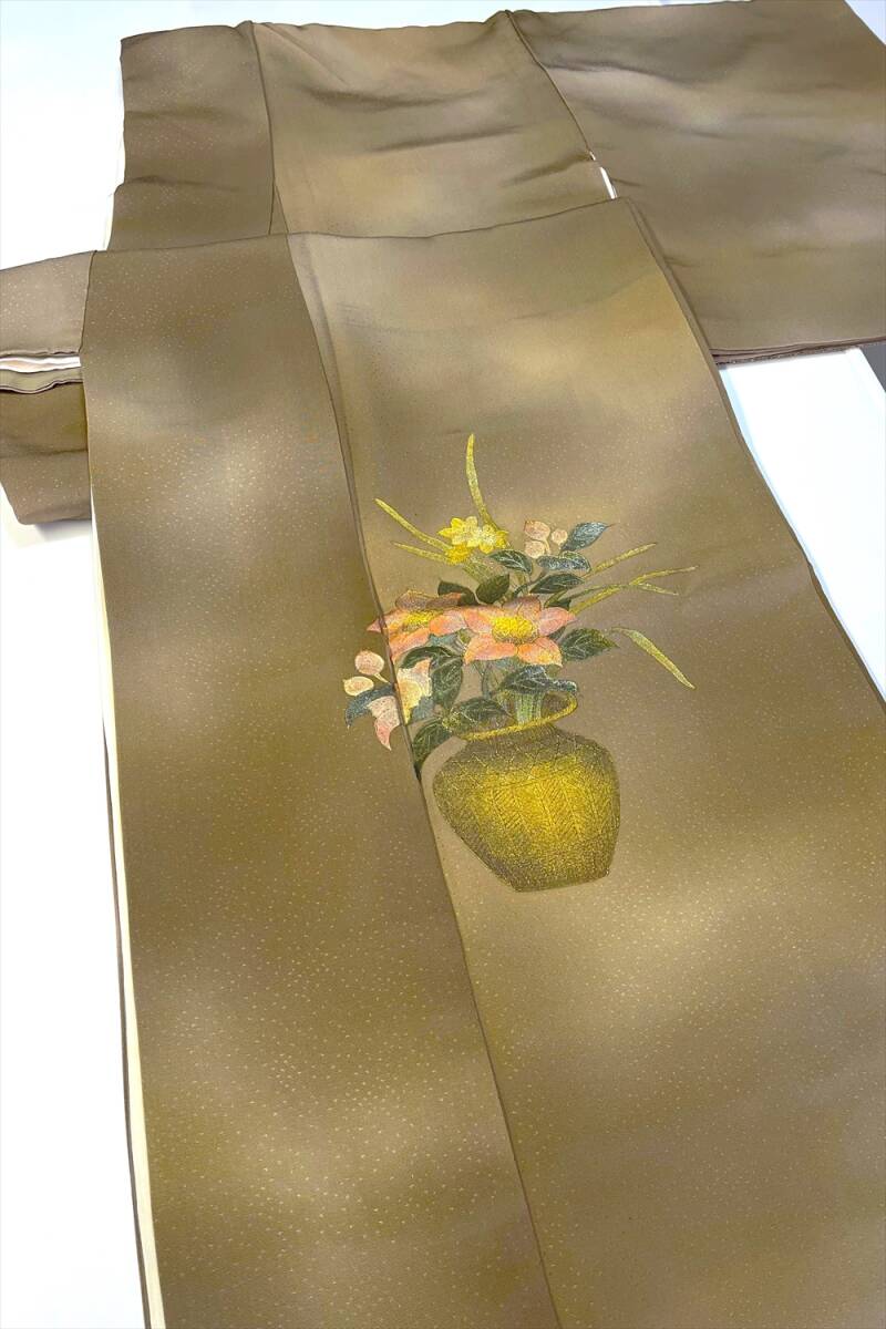 - 花とら●リサイクル着物 色留袖 薄茶 黄土色 暈し 花 花瓶 花器 正絹比翼付き 着用可能 リメイク 素材 251105