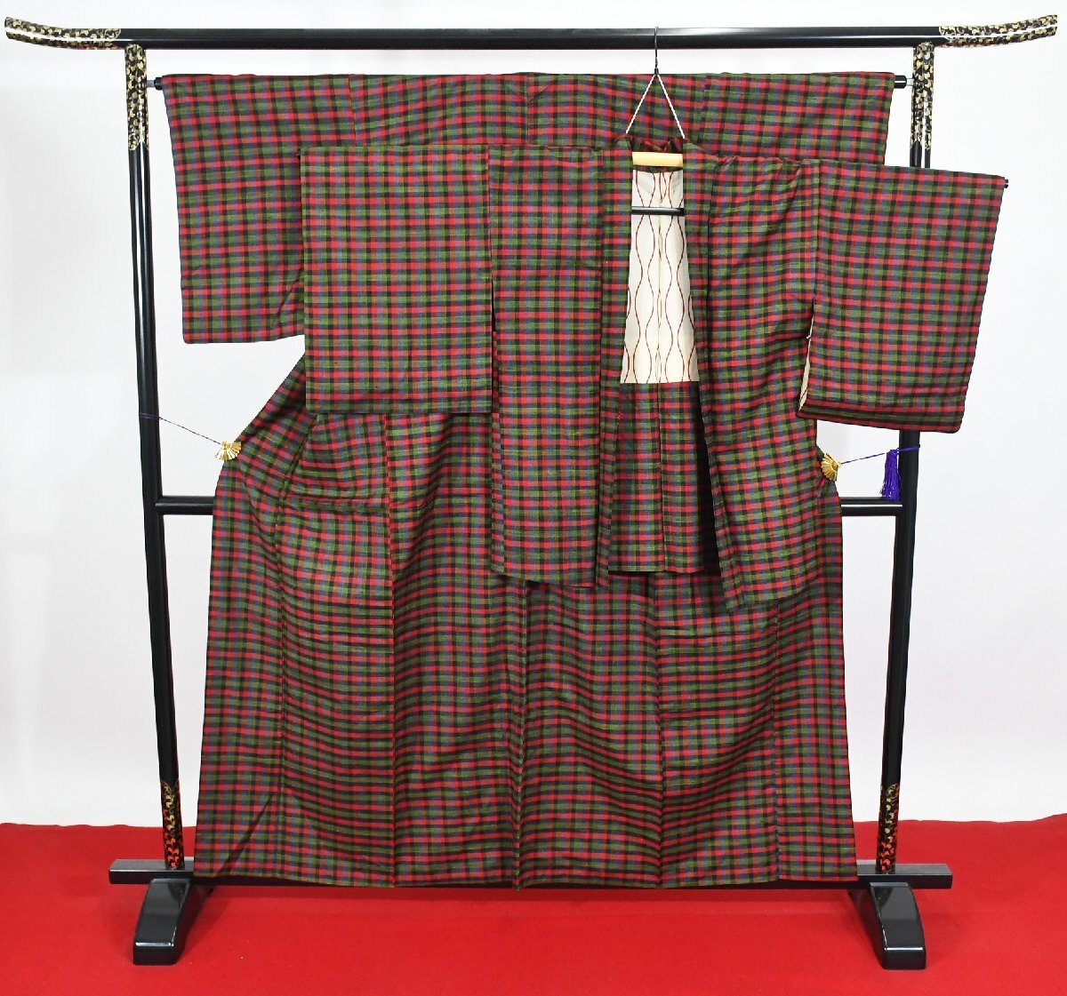 > 紬 つむぎ チェック柄 正絹 アンサンブル セット 羽織 身丈152cm 裄丈65cm ★着物 pb-3886 桜庭呉服店