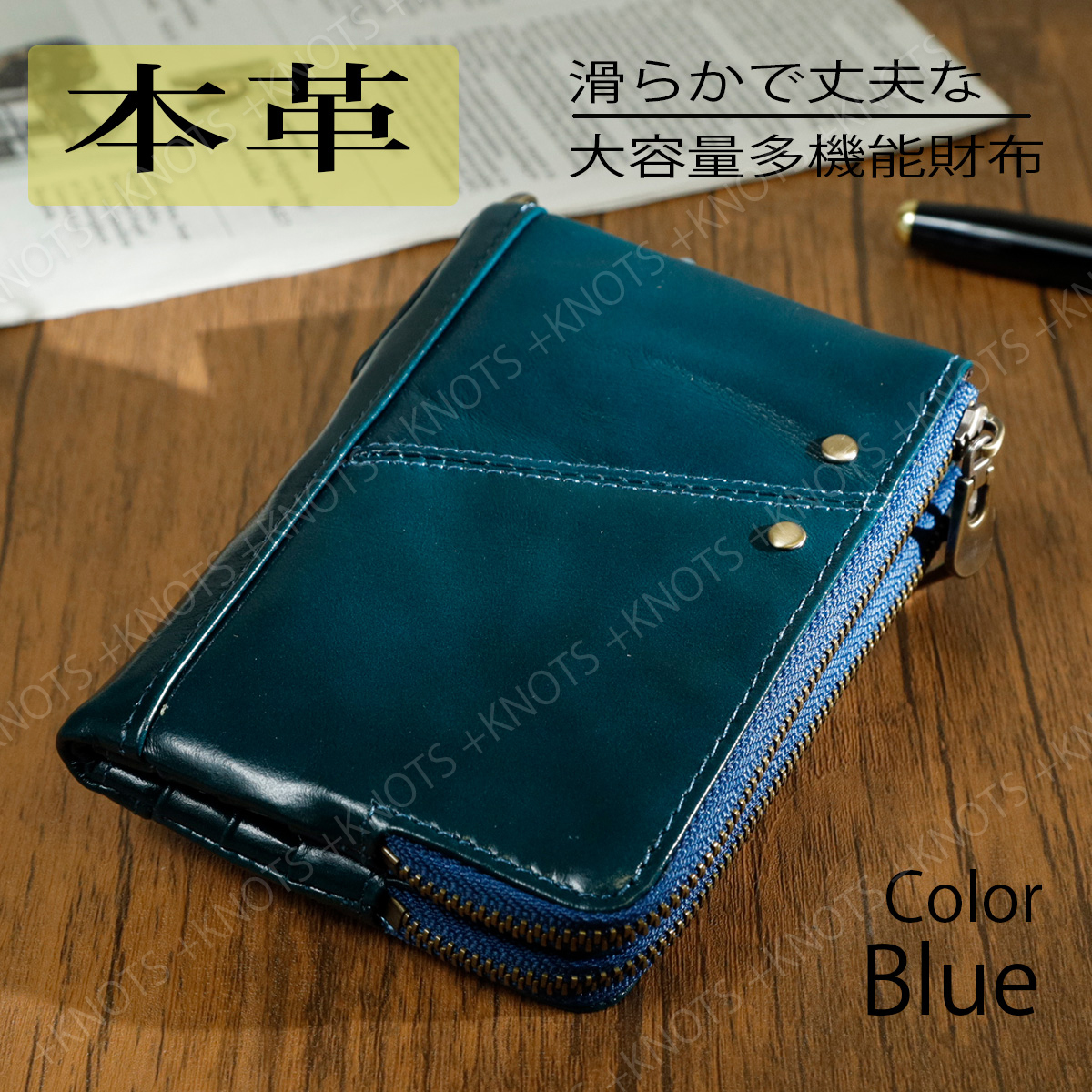 - 本革 多機能二つ折り財布★ブルー青★レディース メンズ 小さい財布 大容量 ふたつおり財布 牛革 レザー チェーンウォレットa276