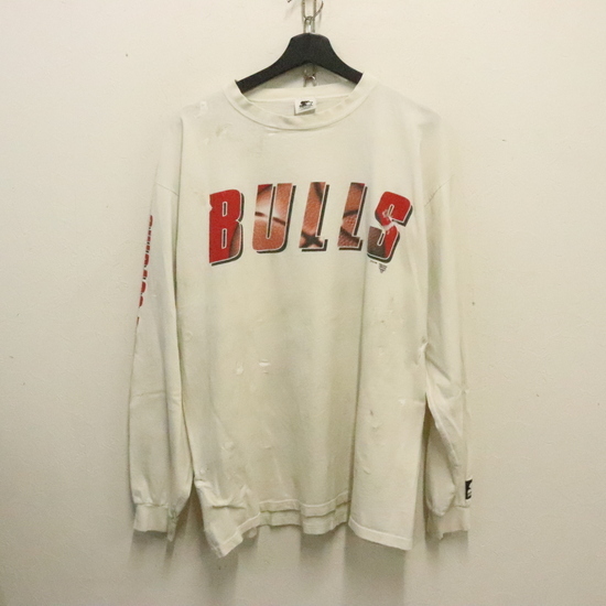> j221 90sビンテージ スターター NBA ブルズ 長袖プリントTシャツ USA製■1990年代製 表記Lサイズ 白 ホワイト アメカジ ストリート 80s 70s