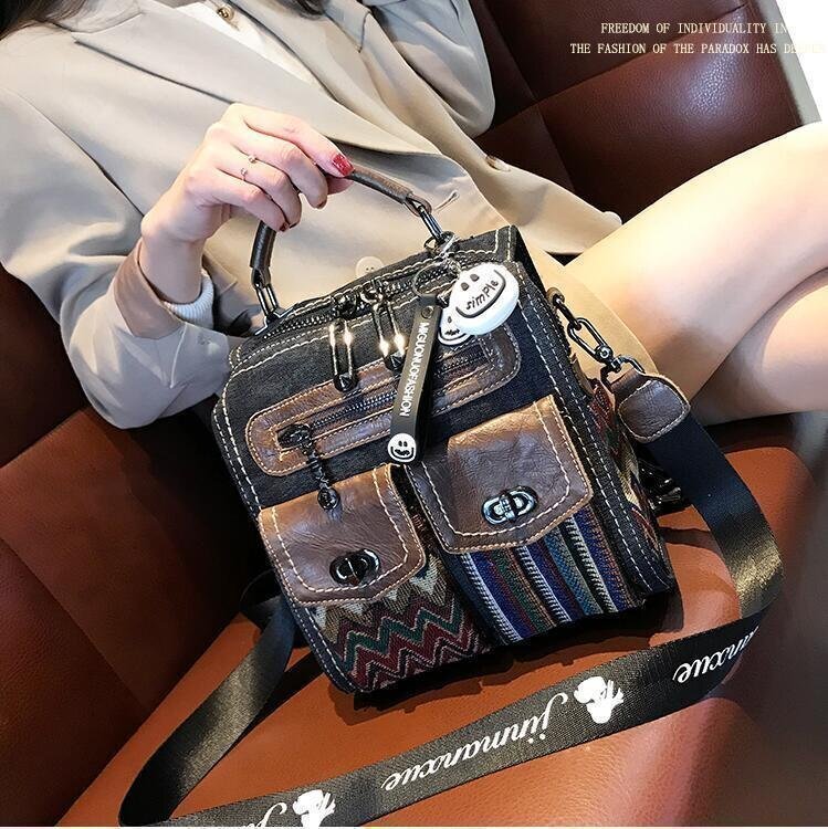 - 新作★超人気★レトロエスニック牛革3斜め掛けデニムでワンショルダーバッグ