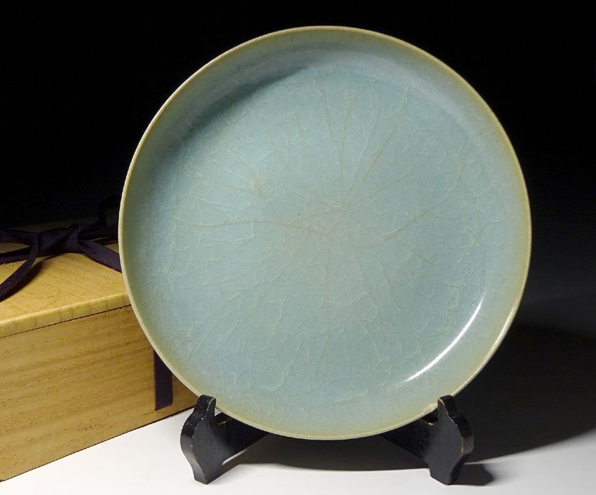 > 緑屋c■ 中国古玩 汝窯 青磁 皿 幅約22cm 木箱 唐物 時代物 i9/10-6554/3-3#80