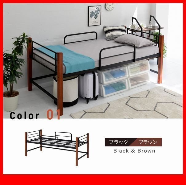 > パイプベッド★天然木脚パイプベッド ミドルタイプ シングル/高級感 安心感 床下空間利用 メッシュ床/ブラックxブラウン/a1