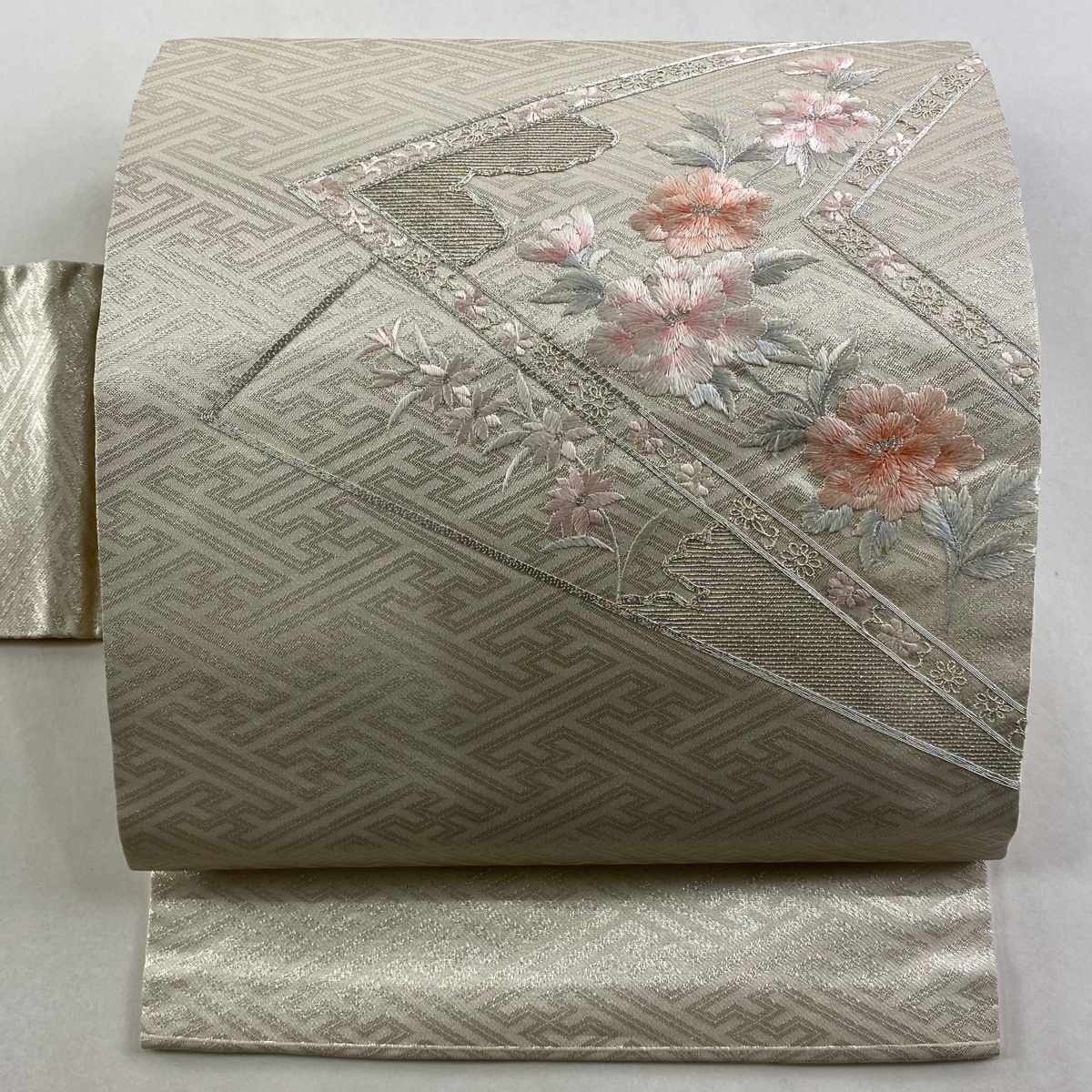 - 名古屋帯 優品 関西仕立て 草花 紗綾形 刺繍 銀糸 銀色 正絹 【中古】