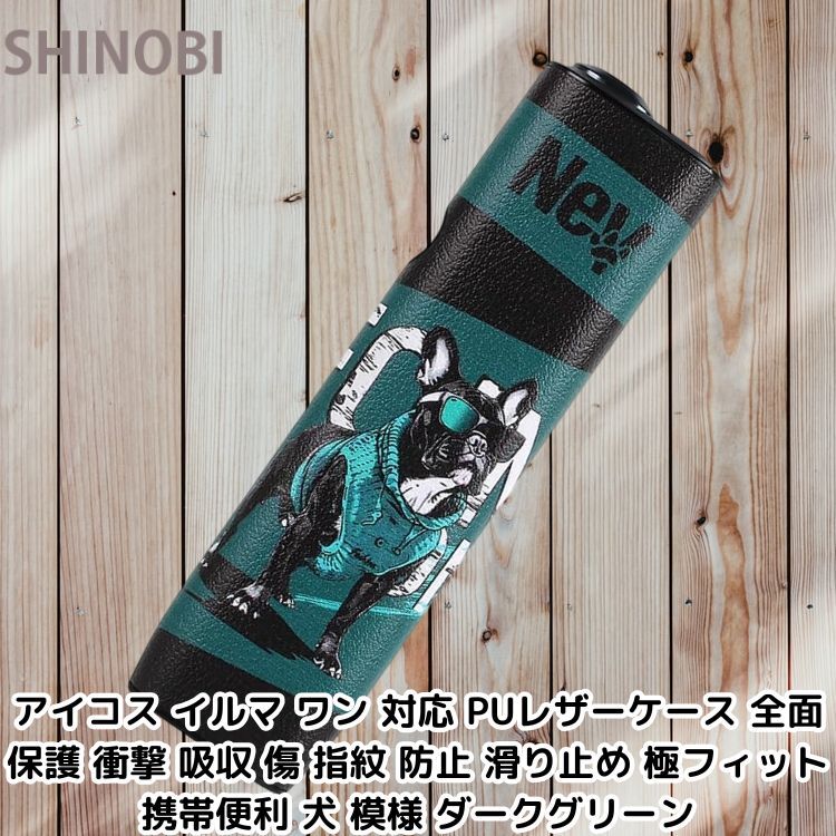 > アイコス イルマ ワン 対応 PUレザーケース 全面 保護 衝撃 吸収 傷 指紋 防止 滑り止め 極フィット 携帯便利 犬 模様 ダークグリーン