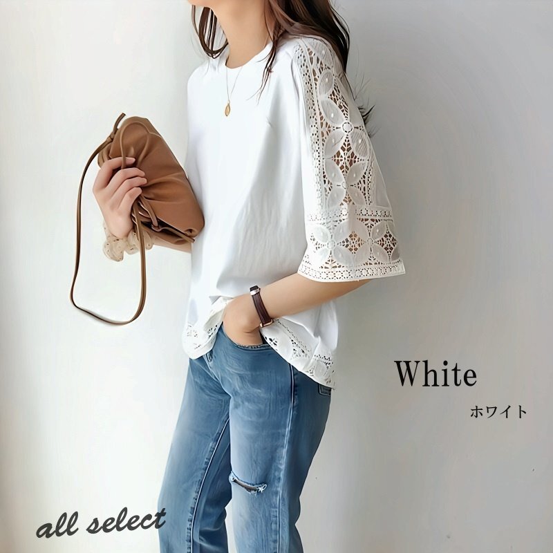 - ホワイト tシャツ レディース カットソー 半袖 Tシャツ レース 刺繍 ゆったり カジュアル Uネック ブラウス クルーネック トップス