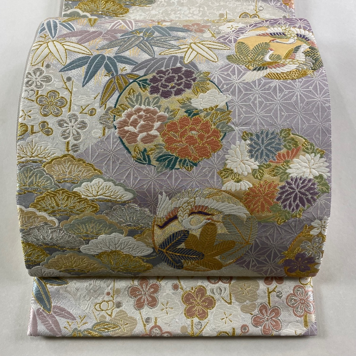 - 【美品】 袋帯 秀品 鈴乃屋 松竹梅 鶴 金銀糸 箔 銀色 六通 正絹 【中古】