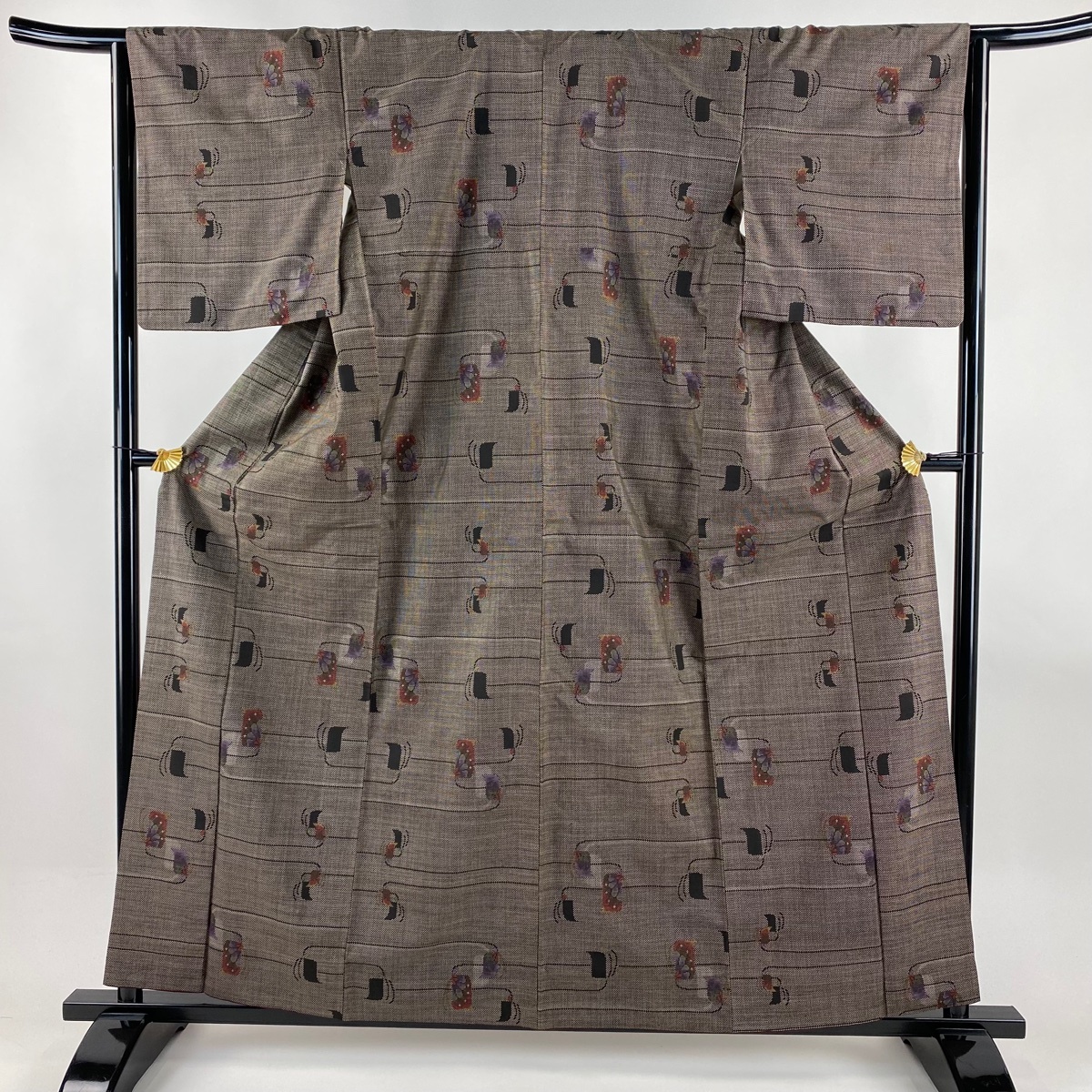 - 紬 身丈160cm 裄丈64cm M 袷 花 幾何学 焦茶色 正絹 秀品 【中古】