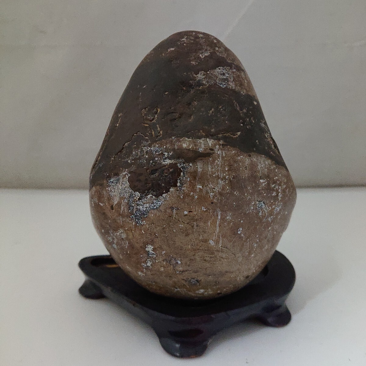 - 【観賞石】 水石 自然石 木製台座付き 重さ約1.8Kg 飾り石 観賞用 当時物 現状品 ぷらみ 1113 72