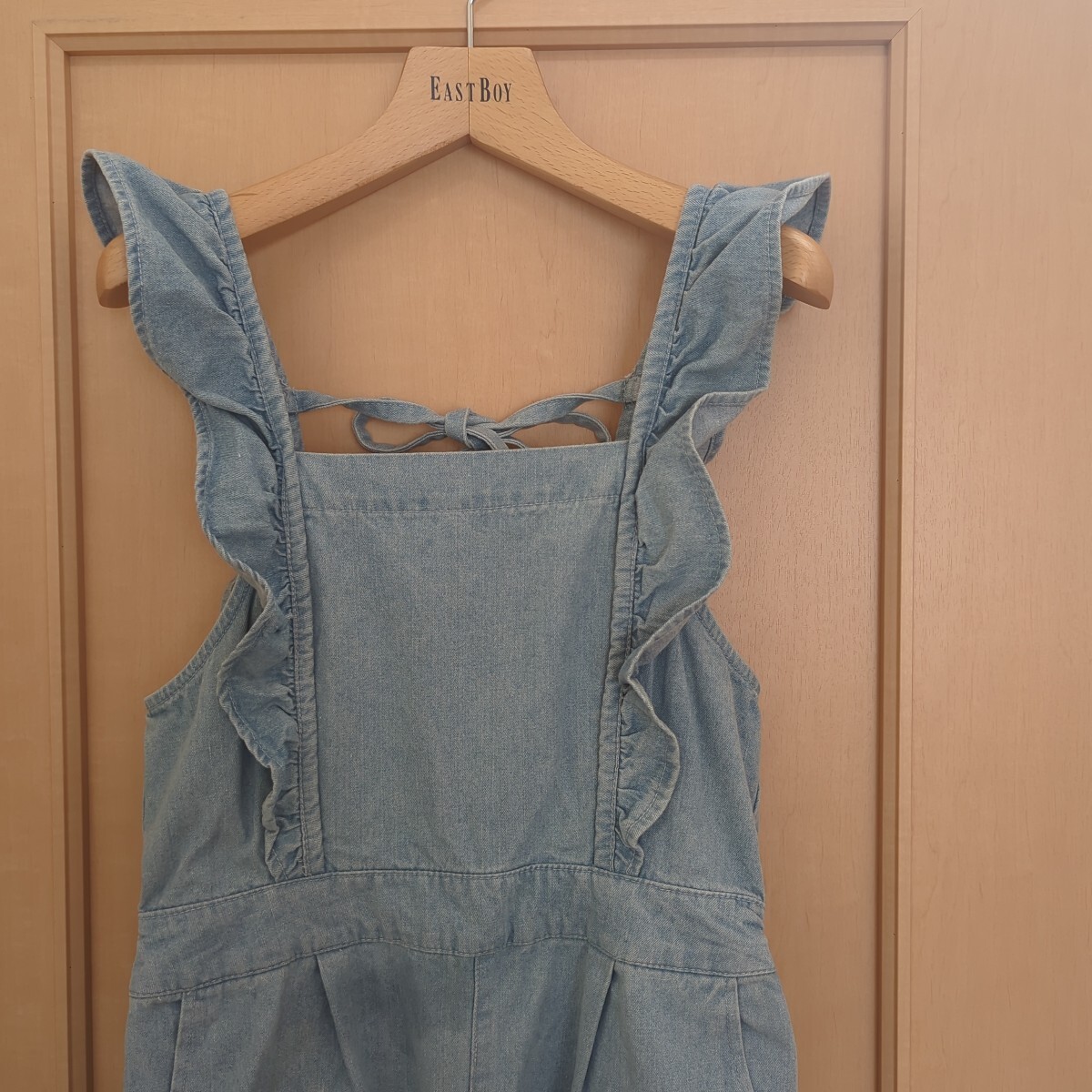- サイズM☆バストサイズ79〜87☆デニム☆ジーパン・ジーンズ☆レディース☆前たてフリル☆サロペット・オーバーオール☆薄い水色☆送料込み