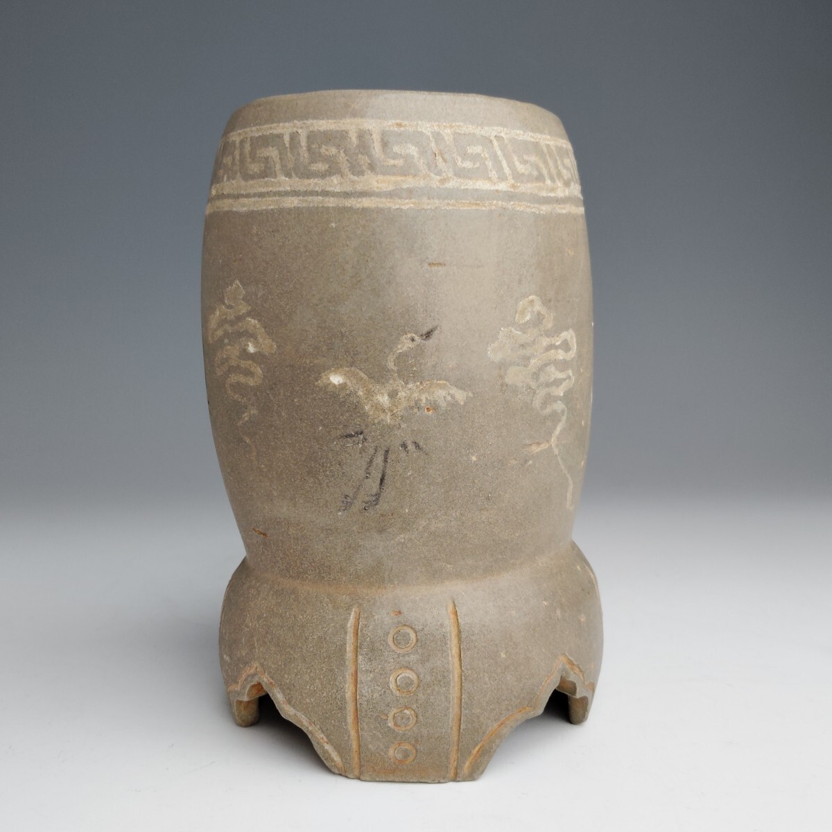 - 高麗青磁 白黒象嵌雲鶴紋筆筒 朝鮮美術 古玩 文房四宝 李朝