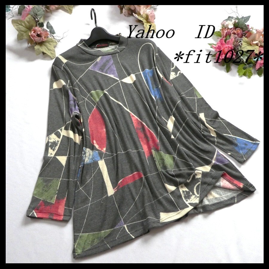 - 3~4L【新品】ポップなアート柄♪ニットソー素材・伸縮たっぷり★ほんのりAラインチュニック◇ブラック◆fit1027◆大きいサイズ