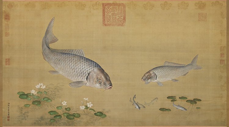 - 清 郎世寧 魚藻図 魚図 双魚図 53 x 95 cm清代画院清代名家の名作花鳥画 掛画 中堂画 装飾画 中国美術zhzx219