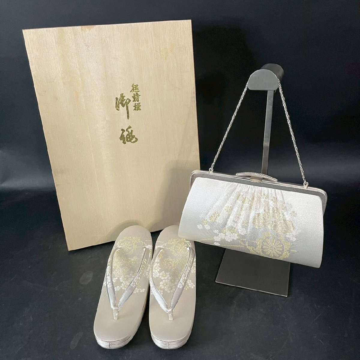 - OM1006-19-3 和小物 下駄 全長23㎝ バッグ H14㎝ W23㎝ D5㎝ 鞄 草履 履物 着物 和装 和服 小物 伝統 レトロ 箱付 ゴールド 100サイズ