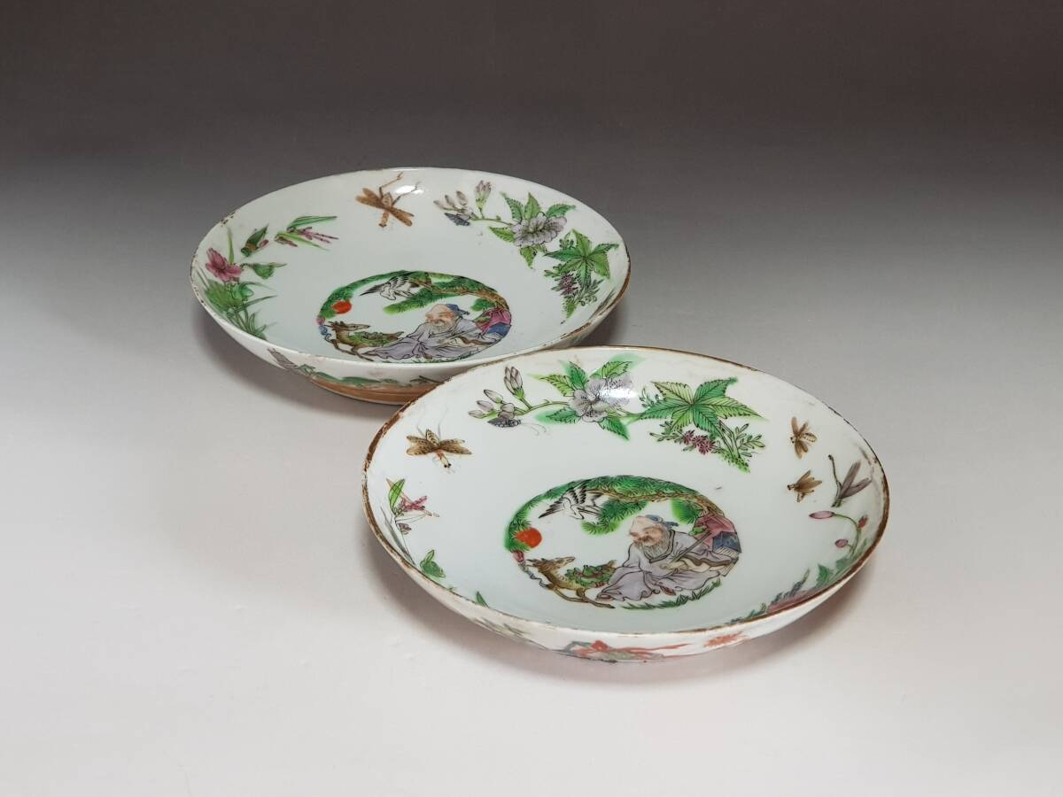 > ● 幅 約 13.2cm 仙人と花文, 吉祥紋が精巧で美しく描かれた 時代唐物 仙人 吉祥花紋 皿 一対・明清時代 盤 皿 手塩皿 浅盤 陶瓷器 ●